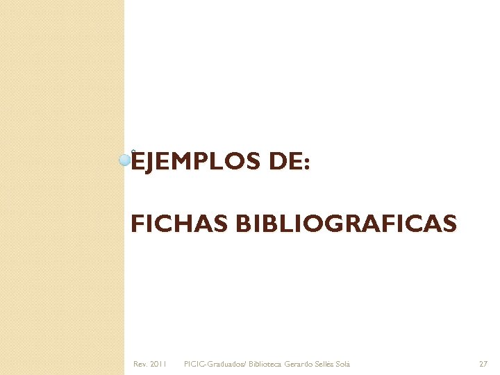EJEMPLOS DE: FICHAS BIBLIOGRAFICAS Rev. 2011 PICIC-Graduados/ Biblioteca Gerardo Sellés Solá 27