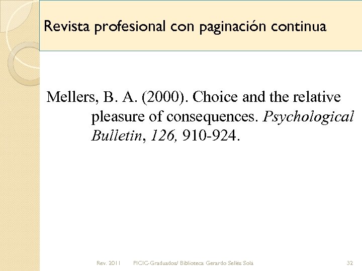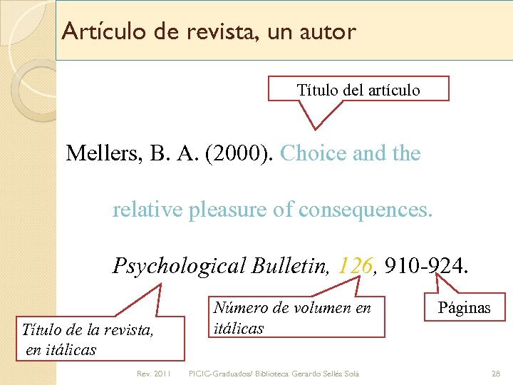 Artículo de revista, un autor Título del artículo Mellers, B. A. (2000). Choice and the relative pleasure of consequences. Psychological Bulletin, 126, 910 -924. Título de la revista, en itálicas Rev. 2011 Número de volumen en itálicas PICIC-Graduados/ Biblioteca Gerardo Sellés Solá Páginas 28