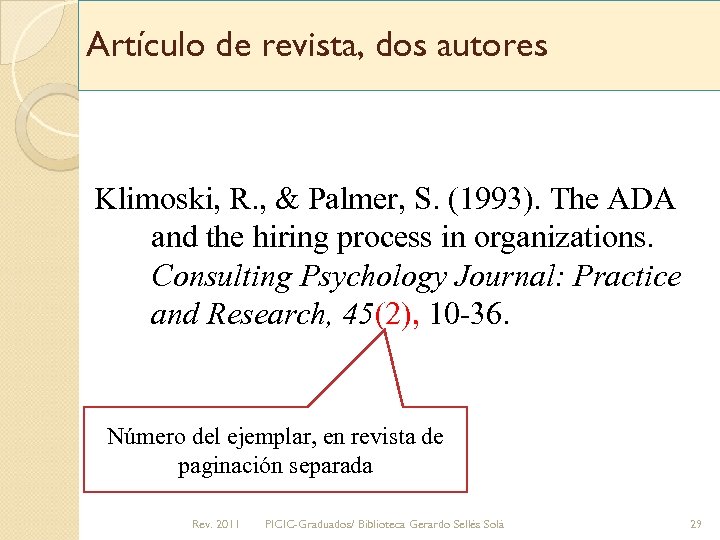 Artículo de revista, dos autores Klimoski, R. , & Palmer, S. (1993). The ADA and the hiring process in organizations. Consulting Psychology Journal: Practice and Research, 45(2), 10 -36. Número del ejemplar, en revista de paginación separada Rev. 2011 PICIC-Graduados/ Biblioteca Gerardo Sellés Solá 29