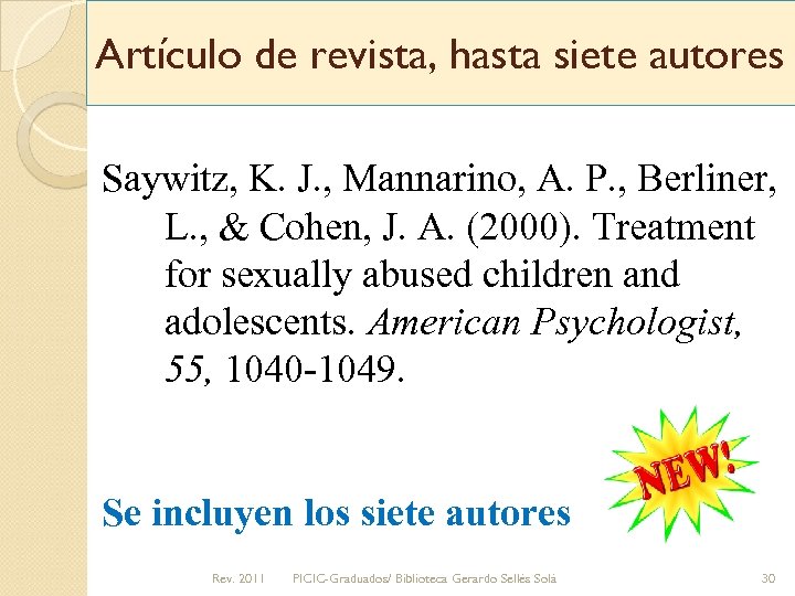 Artículo de revista, hasta siete autores Saywitz, K. J. , Mannarino, A. P. , Berliner, L. , & Cohen, J. A. (2000). Treatment for sexually abused children and adolescents. American Psychologist, 55, 1040 -1049. Se incluyen los siete autores Rev. 2011 PICIC-Graduados/ Biblioteca Gerardo Sellés Solá 30