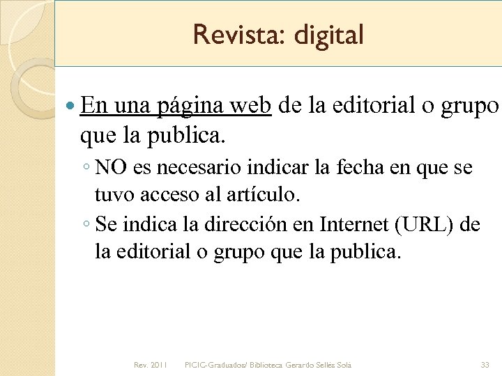 Revista: digital En una página web de la editorial o grupo que la publica. ◦ NO es necesario indicar la fecha en que se tuvo acceso al artículo. ◦ Se indica la dirección en Internet (URL) de la editorial o grupo que la publica. Rev. 2011 PICIC-Graduados/ Biblioteca Gerardo Sellés Solá 33