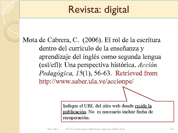 Revista: digital Mota de Cabrera, C. (2006). El rol de la escritura dentro del currículo de la enseñanza y aprendizaje del inglés como segunda lengua (esl/efl): Una perspectiva histórica. Acción Pedagógica, 15(1), 56 -63. Retrieved from http: //www. saber. ula. ve/accionpe/ Indique el URL del sitio web donde reside la publicación. No es necesario incluir fecha de recuperación. Rev. 2011 PICIC-Graduados/ Biblioteca Gerardo Sellés Solá 34