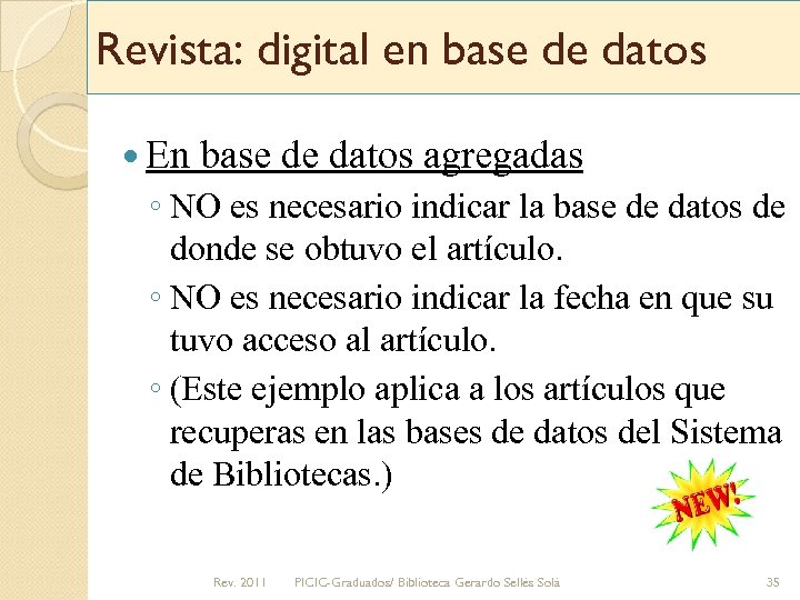 Revista: digital en base de datos En base de datos agregadas ◦ NO es necesario indicar la base de datos de donde se obtuvo el artículo. ◦ NO es necesario indicar la fecha en que su tuvo acceso al artículo. ◦ (Este ejemplo aplica a los artículos que recuperas en las bases de datos del Sistema de Bibliotecas. ) Rev. 2011 PICIC-Graduados/ Biblioteca Gerardo Sellés Solá 35