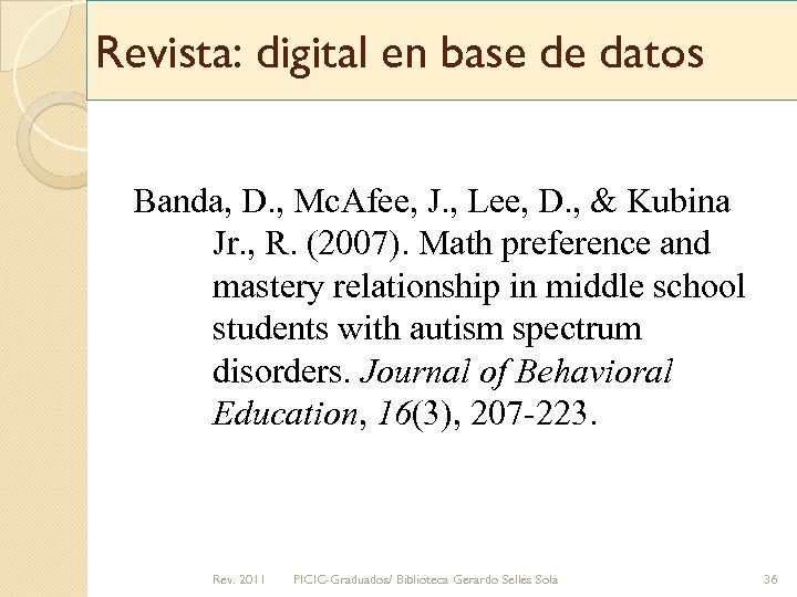 Revista: digital en base de datos Banda, D. , Mc. Afee, J. , Lee, D. , & Kubina Jr. , R. (2007). Math preference and mastery relationship in middle school students with autism spectrum disorders. Journal of Behavioral Education, 16(3), 207 -223. Rev. 2011 PICIC-Graduados/ Biblioteca Gerardo Sellés Solá 36
