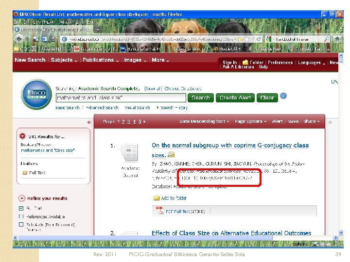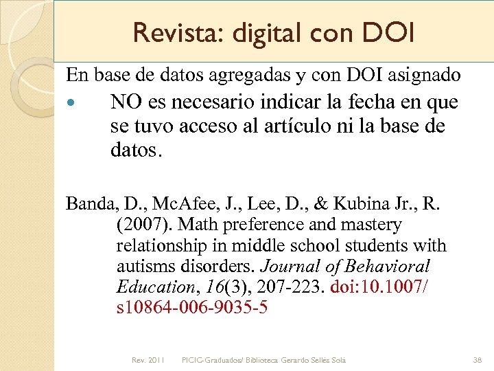 Revista: digital con DOI En base de datos agregadas y con DOI asignado NO es necesario indicar la fecha en que se tuvo acceso al artículo ni la base de datos. Banda, D. , Mc. Afee, J. , Lee, D. , & Kubina Jr. , R. (2007). Math preference and mastery relationship in middle school students with autisms disorders. Journal of Behavioral Education, 16(3), 207 -223. doi: 10. 1007/ s 10864 -006 -9035 -5 Rev. 2011 PICIC-Graduados/ Biblioteca Gerardo Sellés Solá 38