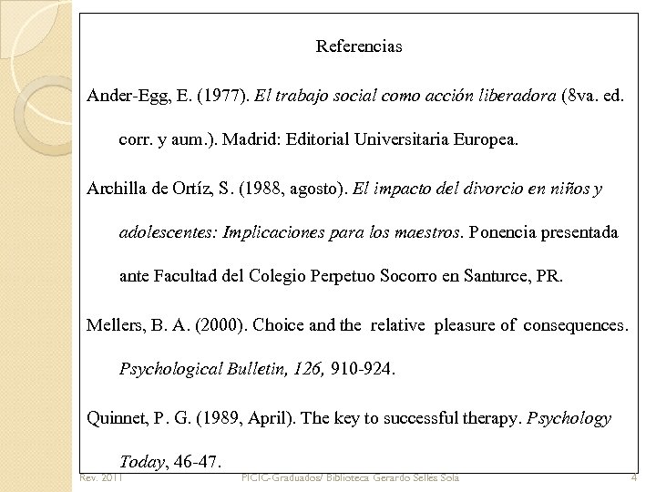 Referencias Ander-Egg, E. (1977). El trabajo social como acción liberadora (8 va. ed. corr. y aum. ). Madrid: Editorial Universitaria Europea. Archilla de Ortíz, S. (1988, agosto). El impacto del divorcio en niños y adolescentes: Implicaciones para los maestros. Ponencia presentada ante Facultad del Colegio Perpetuo Socorro en Santurce, PR. Mellers, B. A. (2000). Choice and the relative pleasure of consequences. Psychological Bulletin, 126, 910 -924. Quinnet, P. G. (1989, April). The key to successful therapy. Psychology Today, 46 -47. Rev. 2011 PICIC-Graduados/ Biblioteca Gerardo Sellés Solá 4
