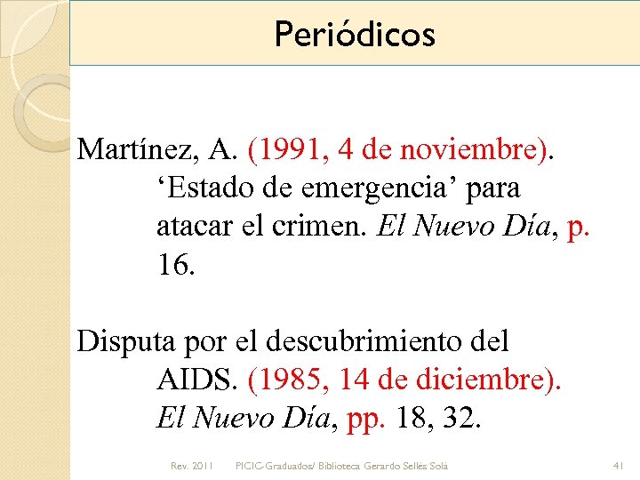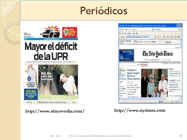 Periódicos http: //www. elnuevodia. com/ Rev. 2011 http: //www. nytimes. com PICIC-Graduados/ Biblioteca Gerardo Sellés Solá 40