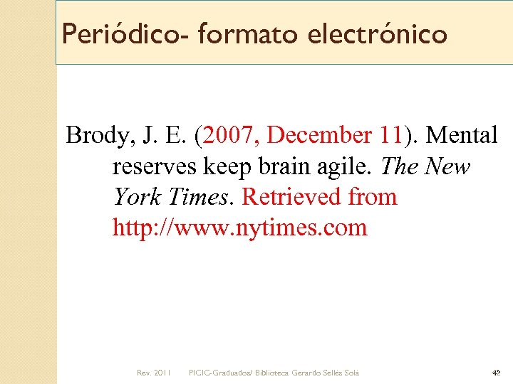 Periódico- formato electrónico Brody, J. E. (2007, December 11). Mental reserves keep brain agile. The New York Times. Retrieved from http: //www. nytimes. com Rev. 2011 PICIC-Graduados/ Biblioteca Gerardo Sellés Solá 42 42