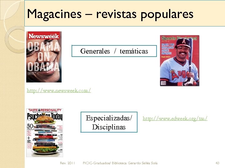 Magacines – revistas populares Generales / temáticas http: //www. newsweek. com/ Especializadas/ Disciplinas Rev. 2011 http: //www. edweek. org/tm/ PICIC-Graduados/ Biblioteca Gerardo Sellés Solá 43