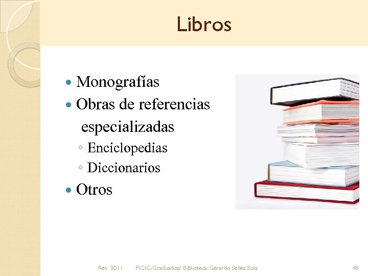 Libros Monografías Obras de referencias especializadas ◦ Enciclopedias ◦ Diccionarios Otros Rev. 2011 PICIC-Graduados/ Biblioteca Gerardo Sellés Solá 45