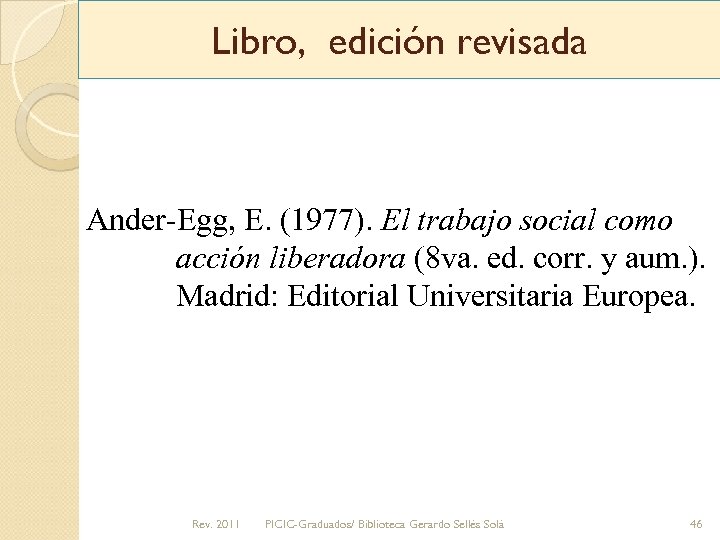 Libro, edición revisada Ander-Egg, E. (1977). El trabajo social como acción liberadora (8 va. ed. corr. y aum. ). Madrid: Editorial Universitaria Europea. Rev. 2011 PICIC-Graduados/ Biblioteca Gerardo Sellés Solá 46