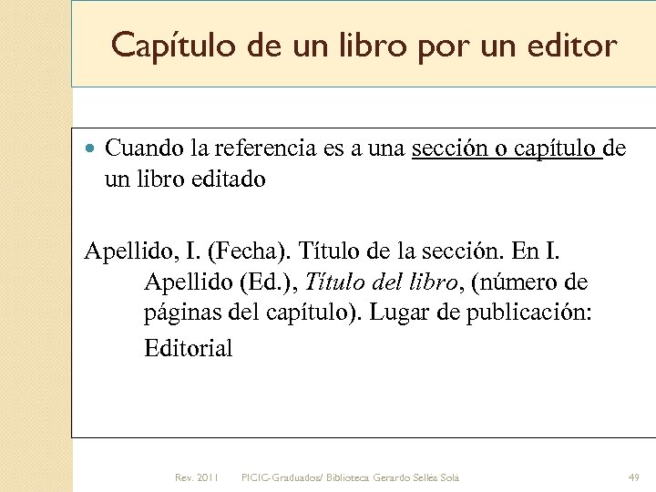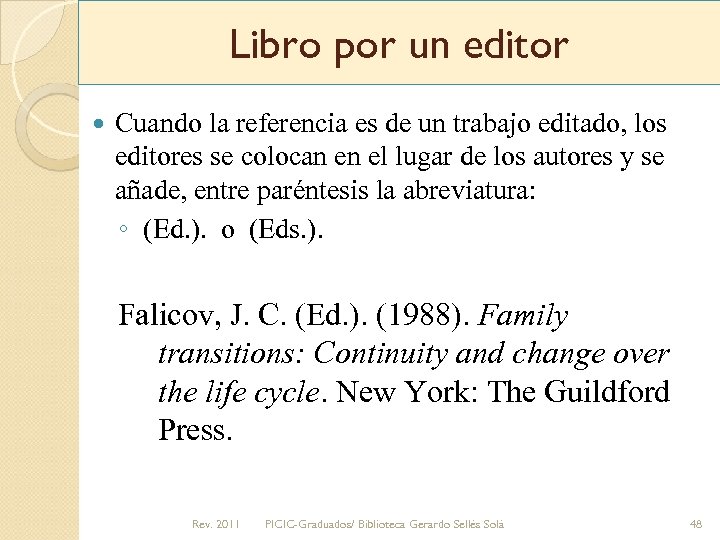 Libro por un editor Cuando la referencia es de un trabajo editado, los editores se colocan en el lugar de los autores y se añade, entre paréntesis la abreviatura: ◦ (Ed. ). o (Eds. ). Falicov, J. C. (Ed. ). (1988). Family transitions: Continuity and change over the life cycle. New York: The Guildford Press. Rev. 2011 PICIC-Graduados/ Biblioteca Gerardo Sellés Solá 48