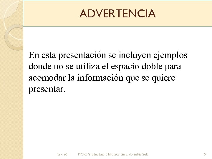 ADVERTENCIA En esta presentación se incluyen ejemplos donde no se utiliza el espacio doble para acomodar la información que se quiere presentar. Rev. 2011 PICIC-Graduados/ Biblioteca Gerardo Sellés Solá 5