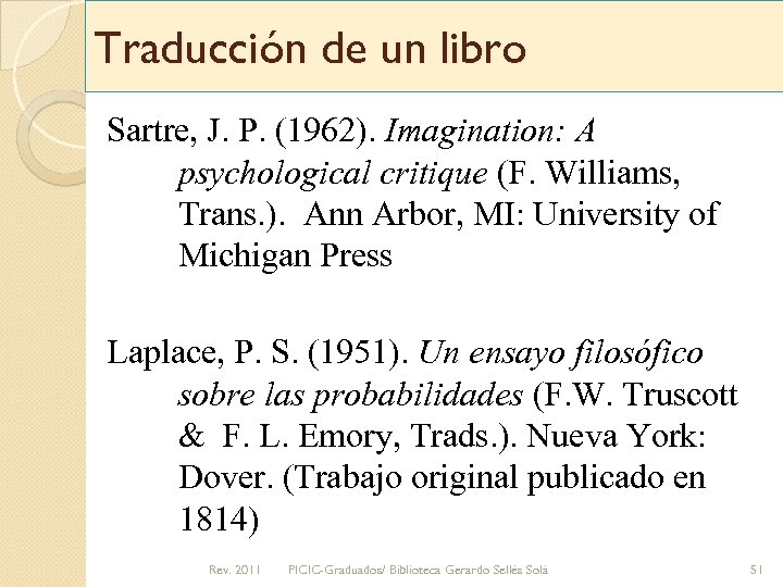 Traducción de un libro Sartre, J. P. (1962). Imagination: A psychological critique (F. Williams, Trans. ). Ann Arbor, MI: University of Michigan Press Laplace, P. S. (1951). Un ensayo filosófico sobre las probabilidades (F. W. Truscott & F. L. Emory, Trads. ). Nueva York: Dover. (Trabajo original publicado en 1814) Rev. 2011 PICIC-Graduados/ Biblioteca Gerardo Sellés Solá 51