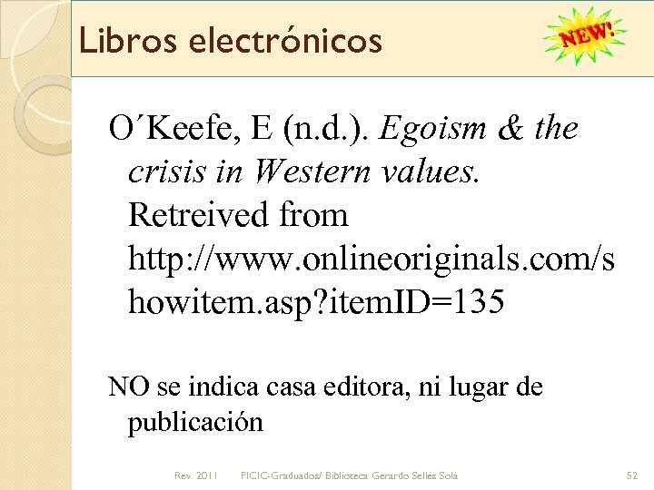 Libros electrónicos O´Keefe, E (n. d. ). Egoism & the crisis in Western values. Retreived from http: //www. onlineoriginals. com/s howitem. asp? item. ID=135 NO se indica casa editora, ni lugar de publicación Rev. 2011 PICIC-Graduados/ Biblioteca Gerardo Sellés Solá 52