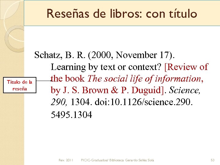 Reseñas de libros: con título Schatz, B. R. (2000, November 17). Learning by text or context? [Review of the book The social life of information, Título de la reseña by J. S. Brown & P. Duguid]. Science, 290, 1304. doi: 10. 1126/science. 290. 5495. 1304 Rev. 2011 PICIC-Graduados/ Biblioteca Gerardo Sellés Solá 53