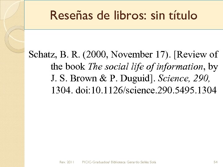 Reseñas de libros: sin título Schatz, B. R. (2000, November 17). [Review of the book The social life of information, by J. S. Brown & P. Duguid]. Science, 290, 1304. doi: 10. 1126/science. 290. 5495. 1304 Rev. 2011 PICIC-Graduados/ Biblioteca Gerardo Sellés Solá 54