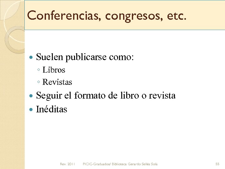 Conferencias, congresos, etc. Suelen publicarse como: ◦ Libros ◦ Revistas Seguir el formato de libro o revista Inéditas Rev. 2011 PICIC-Graduados/ Biblioteca Gerardo Sellés Solá 55