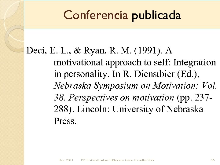 Conferencia publicada Deci, E. L. , & Ryan, R. M. (1991). A motivational approach to self: Integration in personality. In R. Dienstbier (Ed. ), Nebraska Symposium on Motivation: Vol. 38. Perspectives on motivation (pp. 237288). Lincoln: University of Nebraska Press. Rev. 2011 PICIC-Graduados/ Biblioteca Gerardo Sellés Solá 56