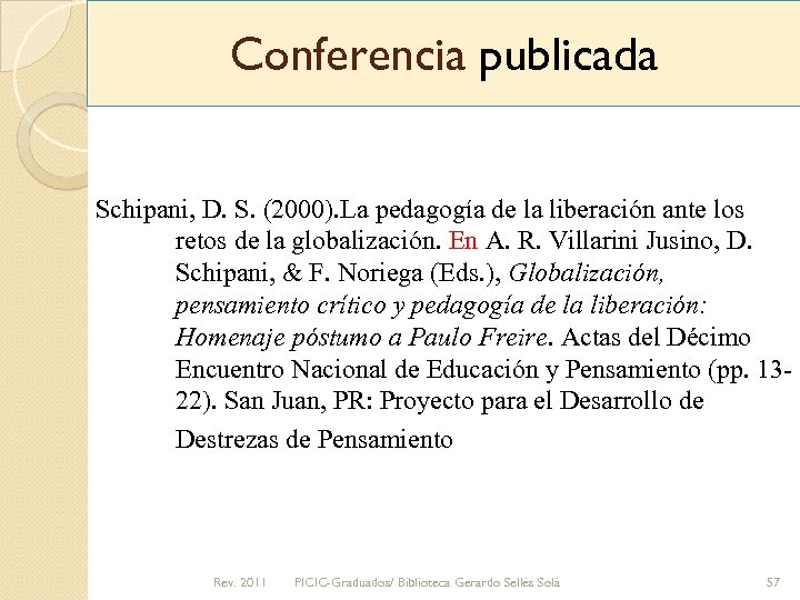 Conferencia publicada Schipani, D. S. (2000). La pedagogía de la liberación ante los retos de la globalización. En A. R. Villarini Jusino, D. Schipani, & F. Noriega (Eds. ), Globalización, pensamiento crítico y pedagogía de la liberación: Homenaje póstumo a Paulo Freire. Actas del Décimo Encuentro Nacional de Educación y Pensamiento (pp. 1322). San Juan, PR: Proyecto para el Desarrollo de Destrezas de Pensamiento Rev. 2011 PICIC-Graduados/ Biblioteca Gerardo Sellés Solá 57