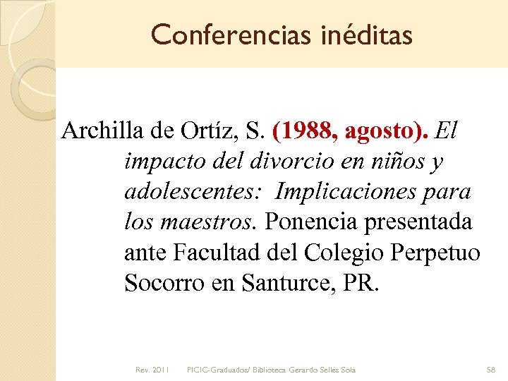 Conferencias inéditas Archilla de Ortíz, S. (1988, agosto). El impacto del divorcio en niños y adolescentes: Implicaciones para los maestros. Ponencia presentada ante Facultad del Colegio Perpetuo Socorro en Santurce, PR. Rev. 2011 PICIC-Graduados/ Biblioteca Gerardo Sellés Solá 58