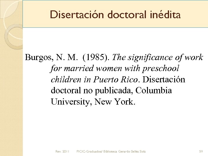 Disertación doctoral inédita Burgos, N. M. (1985). The significance of work for married women with preschool children in Puerto Rico. Disertación doctoral no publicada, Columbia University, New York. Rev. 2011 PICIC-Graduados/ Biblioteca Gerardo Sellés Solá 59