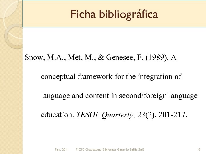 Ficha bibliográfica Snow, M. A. , Met, M. , & Genesee, F. (1989). A conceptual framework for the integration of language and content in second/foreign language education. TESOL Quarterly, 23(2), 201 -217. Rev. 2011 PICIC-Graduados/ Biblioteca Gerardo Sellés Solá 6