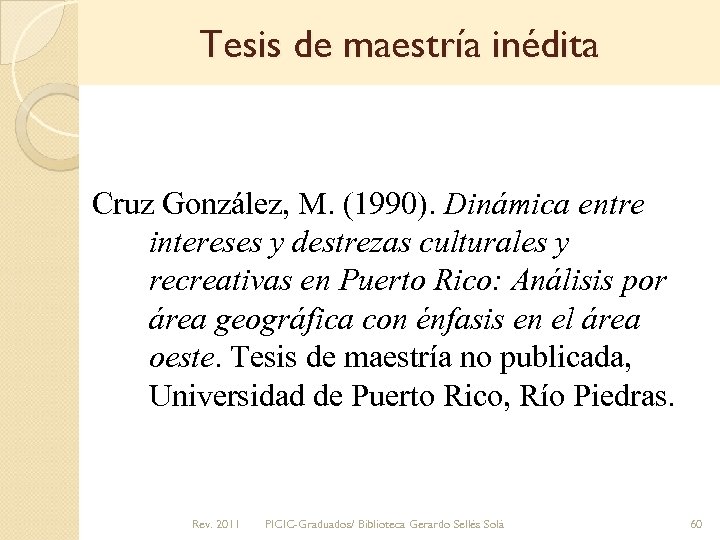 Tesis de maestría inédita Cruz González, M. (1990). Dinámica entre intereses y destrezas culturales y recreativas en Puerto Rico: Análisis por área geográfica con énfasis en el área oeste. Tesis de maestría no publicada, Universidad de Puerto Rico, Río Piedras. Rev. 2011 PICIC-Graduados/ Biblioteca Gerardo Sellés Solá 60