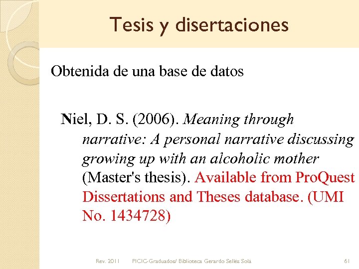 Tesis y disertaciones Obtenida de una base de datos Niel, D. S. (2006). Meaning through narrative: A personal narrative discussing growing up with an alcoholic mother (Master's thesis). Available from Pro. Quest Dissertations and Theses database. (UMI No. 1434728) Rev. 2011 PICIC-Graduados/ Biblioteca Gerardo Sellés Solá 61