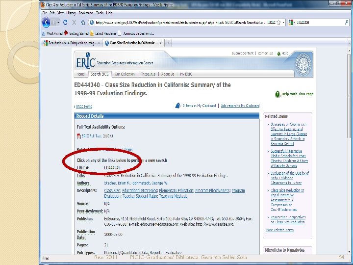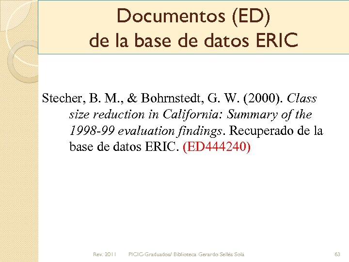 Documentos (ED) de la base de datos ERIC Stecher, B. M. , & Bohrnstedt, G. W. (2000). Class size reduction in California: Summary of the 1998 -99 evaluation findings. Recuperado de la base de datos ERIC. (ED 444240) Rev. 2011 PICIC-Graduados/ Biblioteca Gerardo Sellés Solá 63