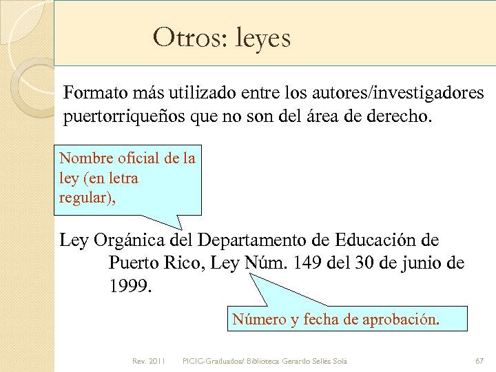 Otros: leyes Formato más utilizado entre los autores/investigadores puertorriqueños que no son del área de derecho. Nombre oficial de la ley (en letra regular), Ley Orgánica del Departamento de Educación de Puerto Rico, Ley Núm. 149 del 30 de junio de 1999. Número y fecha de aprobación. Rev. 2011 PICIC-Graduados/ Biblioteca Gerardo Sellés Solá 67