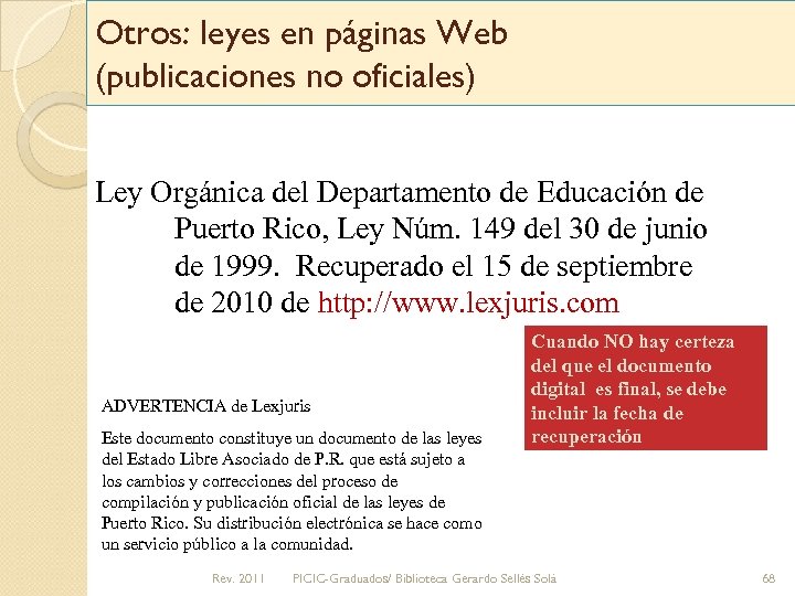 Otros: leyes en páginas Web (publicaciones no oficiales) Ley Orgánica del Departamento de Educación de Puerto Rico, Ley Núm. 149 del 30 de junio de 1999. Recuperado el 15 de septiembre de 2010 de http: //www. lexjuris. com ADVERTENCIA de Lexjuris Este documento constituye un documento de las leyes del Estado Libre Asociado de P. R. que está sujeto a los cambios y correcciones del proceso de compilación y publicación oficial de las leyes de Puerto Rico. Su distribución electrónica se hace como un servicio público a la comunidad. Rev. 2011 Cuando NO hay certeza del que el documento digital es final, se debe incluir la fecha de recuperación PICIC-Graduados/ Biblioteca Gerardo Sellés Solá 68