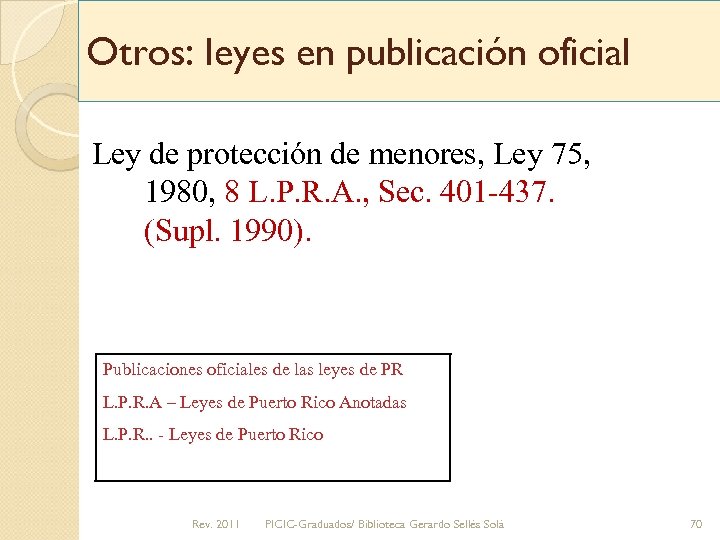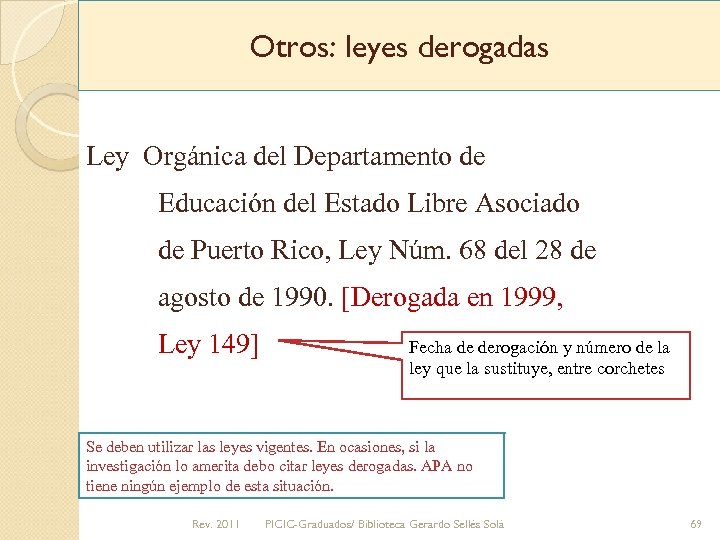 Otros: leyes derogadas Ley Orgánica del Departamento de Educación del Estado Libre Asociado de Puerto Rico, Ley Núm. 68 del 28 de agosto de 1990. [Derogada en 1999, Ley 149] Fecha de derogación y número de la ley que la sustituye, entre corchetes Se deben utilizar las leyes vigentes. En ocasiones, si la investigación lo amerita debo citar leyes derogadas. APA no tiene ningún ejemplo de esta situación. Rev. 2011 PICIC-Graduados/ Biblioteca Gerardo Sellés Solá 69