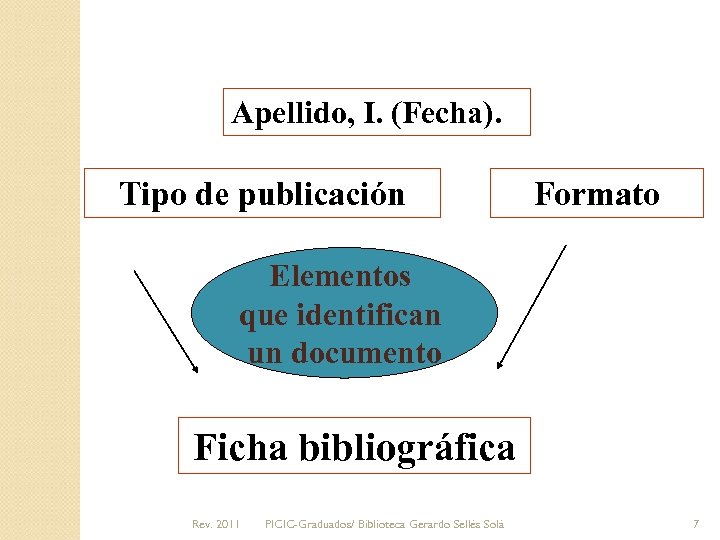 Apellido, I. (Fecha). Tipo de publicación Formato Elementos que identifican un documento Ficha bibliográfica Rev. 2011 PICIC-Graduados/ Biblioteca Gerardo Sellés Solá 7