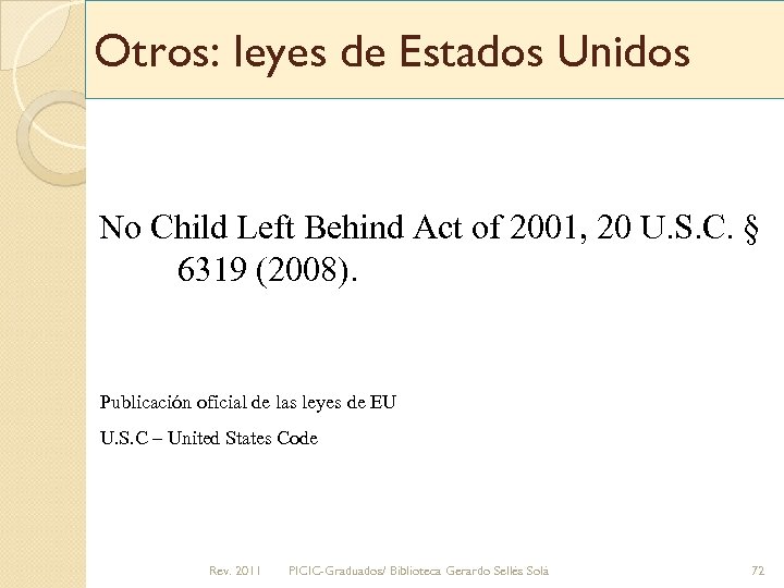 Otros: leyes de Estados Unidos No Child Left Behind Act of 2001, 20 U. S. C. § 6319 (2008). Publicación oficial de las leyes de EU U. S. C – United States Code Rev. 2011 PICIC-Graduados/ Biblioteca Gerardo Sellés Solá 72