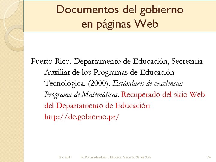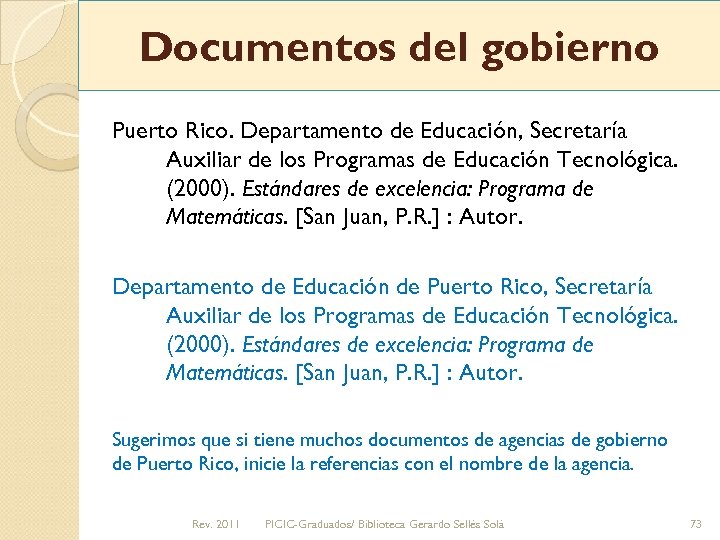 Documentos del gobierno Puerto Rico. Departamento de Educación, Secretaría Auxiliar de los Programas de Educación Tecnológica. (2000). Estándares de excelencia: Programa de Matemáticas. [San Juan, P. R. ] : Autor. Departamento de Educación de Puerto Rico, Secretaría Auxiliar de los Programas de Educación Tecnológica. (2000). Estándares de excelencia: Programa de Matemáticas. [San Juan, P. R. ] : Autor. Sugerimos que si tiene muchos documentos de agencias de gobierno de Puerto Rico, inicie la referencias con el nombre de la agencia. Rev. 2011 PICIC-Graduados/ Biblioteca Gerardo Sellés Solá 73