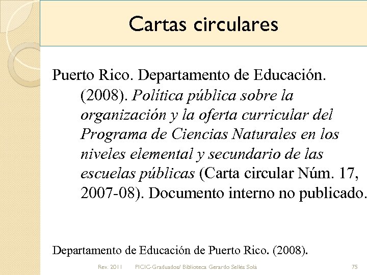 Cartas circulares Puerto Rico. Departamento de Educación. (2008). Política pública sobre la organización y la oferta curricular del Programa de Ciencias Naturales en los niveles elemental y secundario de las escuelas públicas (Carta circular Núm. 17, 2007 -08). Documento interno no publicado. Departamento de Educación de Puerto Rico. (2008). Rev. 2011 PICIC-Graduados/ Biblioteca Gerardo Sellés Solá 75