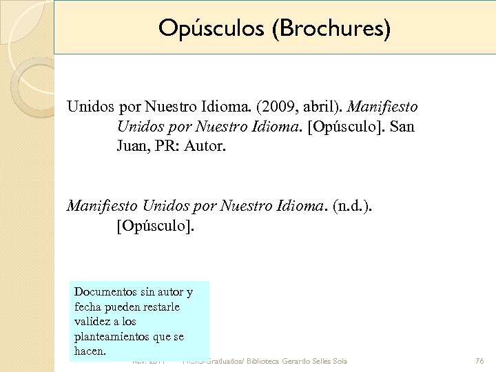Opúsculos (Brochures) Unidos por Nuestro Idioma. (2009, abril). Manifiesto Unidos por Nuestro Idioma. [Opúsculo]. San Juan, PR: Autor. Manifiesto Unidos por Nuestro Idioma. (n. d. ). [Opúsculo]. Documentos sin autor y fecha pueden restarle validez a los planteamientos que se hacen. Rev. 2011 PICIC-Graduados/ Biblioteca Gerardo Sellés Solá 76