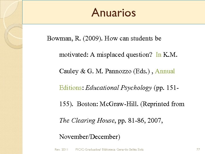 Anuarios Bowman, R. (2009). How can students be motivated: A misplaced question? In K. M. Cauley & G. M. Pannozzo (Eds. ) , Annual Editions: Educational Psychology (pp. 151155). Boston: Mc. Graw-Hill. (Reprinted from The Clearing House, pp. 81 -86, 2007, November/December) Rev. 2011 PICIC-Graduados/ Biblioteca Gerardo Sellés Solá 77