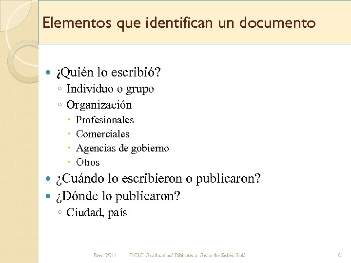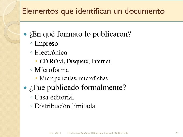 Elementos que identifican un documento ¿Quién lo escribió? ◦ Individuo o grupo ◦ Organización Profesionales Comerciales Agencias de gobierno Otros ¿Cuándo lo escribieron o publicaron? ¿Dónde lo publicaron? ◦ Ciudad, país Rev. 2011 PICIC-Graduados/ Biblioteca Gerardo Sellés Solá 8