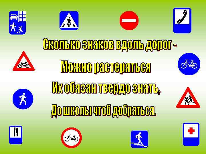 Не напрасно в школе, дома Учат правилам ребят. На дороге можно встретить Много всяческих преград. Чтоб сберечь свое здоровье И аварий избежать, Надо правила дорожные Знать и строго соблюдать.