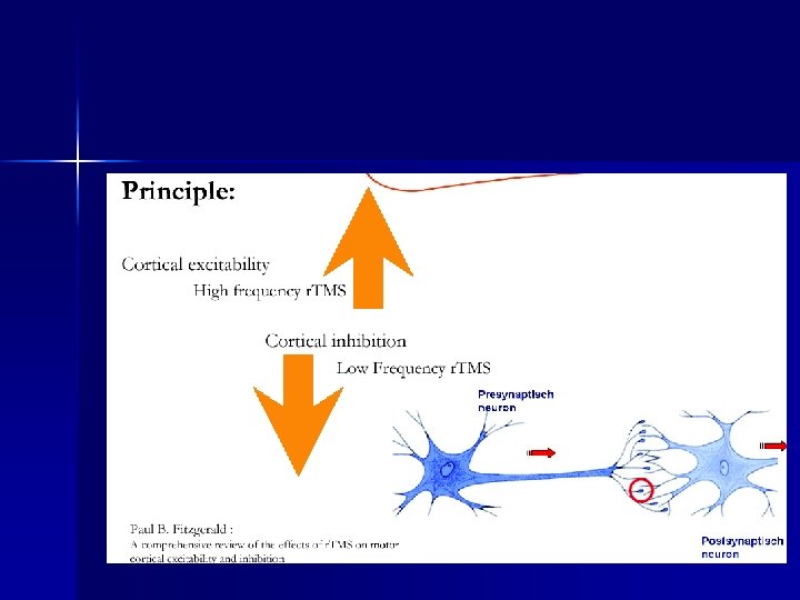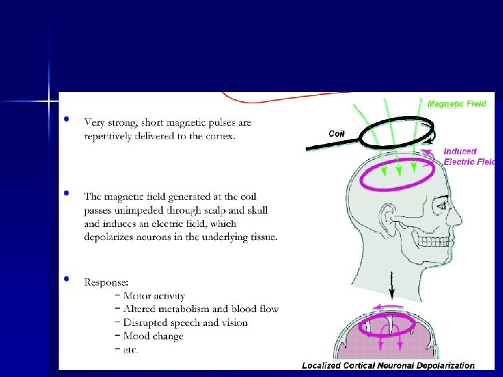 Repetitive transcranial magnetic stimulation (r. TMS) r. TMS - non-invasive method that induces functional changes in a human cerebral cortex (Barker et al. 1985). 5. depolarization on neurons 4. ET current in tissue (prallel and opposite direction as in coi 3. EL field in tissue 2. magnetic field 1. pulse of EL current 0, 1 -0, 2 ms, 2000 V, 10 k. A