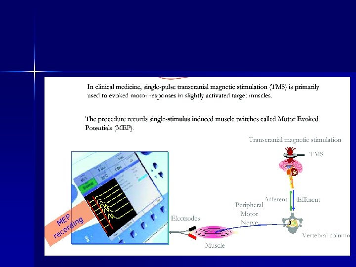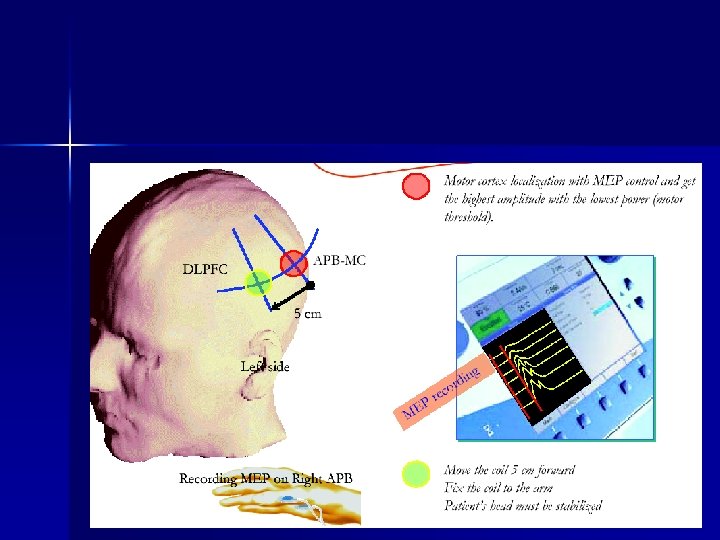 Индикации и приложение n n n Методът е описан от Pascual-Leone et al през 1996 г. Състои се в определяне на моторен праг /МП/ върху двигателната област, от който най-добре се получава мускулен ответ. След определянето на МП бобината се премества с 5 см. напред по парасагиталната линия.