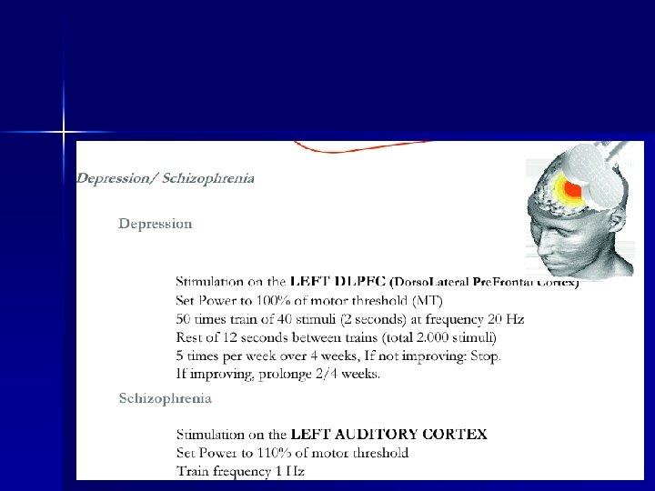 Индикации и приложение n Депресия: обхваща мрежа от вече локализирани сруктури – префронтална, цингуларна, париетална и темпорална кора, стриатум, таламус и хипоталамус. n р. ТМС сравнително точно извършва локализирани фокални въздействия в тези области. n Дорзолатералната префронтална кора е най-често използваната област на стимулация.