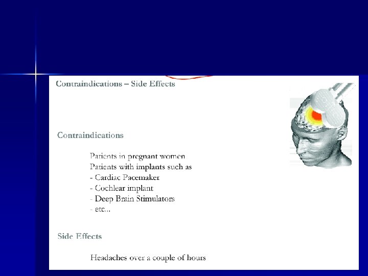 Ниво на безопасност на р. ТМС n n n На този етап няма открити дълготрайни странични ефекти. В редки случаи се отчита леко главоболие след прилагане и още по-рядко припадъци и индуцирана хипомания. Ако вече уточнени емпирични параметри се спазват, лечението е безопасно.
