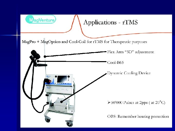 Индикации и приложение n Болест на Алцхаймер – има публикувани доказателства от университети в Ню Йорк и Лондон, че терапия с р. ТМС подобрява функционирането на хипокампалните структури. n По този начин р. ТМС може да забави развитието на болестта.