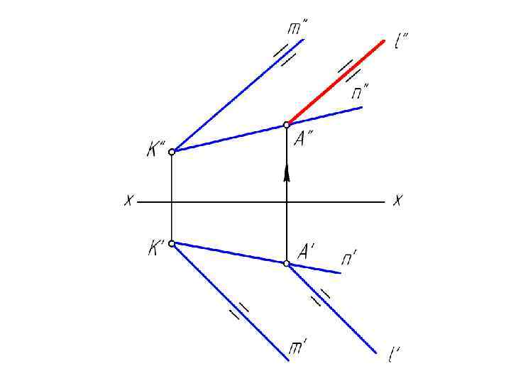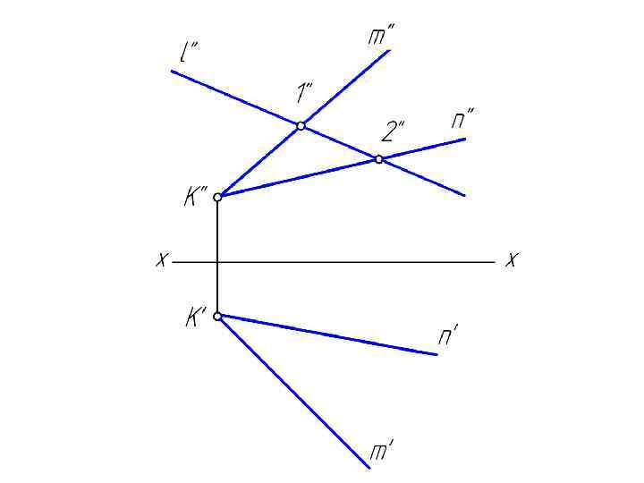 Достроить горизонтальную проекцию прямой l, принадлежащей плоскости, заданной пересекающимися прямыми m и n.