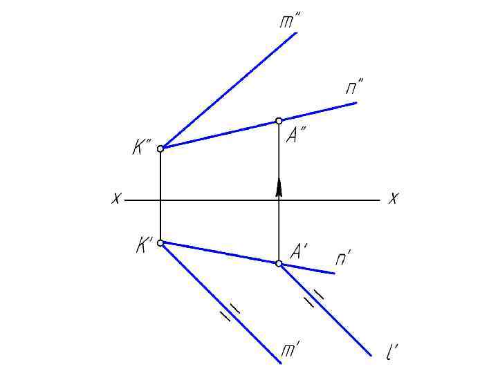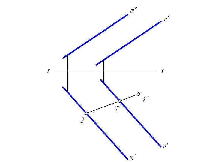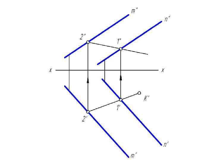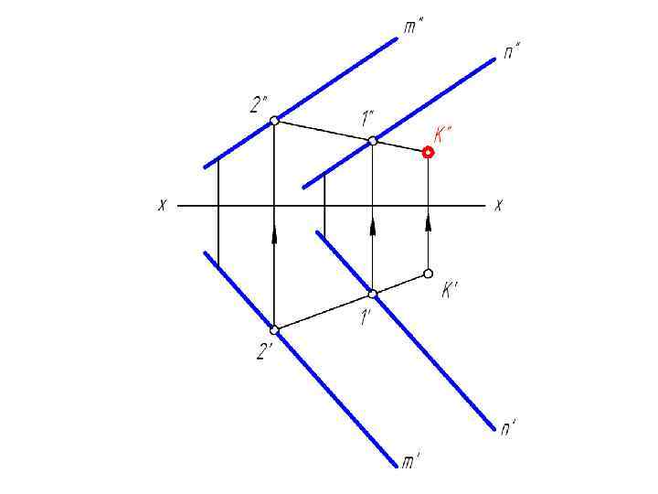 Достроить фронтальную проекцию точки К, принадлежащей плоскости, заданной параллельными прямыми m и n.