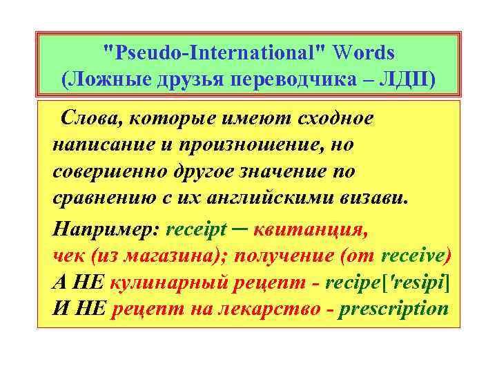 "Pseudo-International" Words (Ложные друзья переводчика – ЛДП) Слова, которые имеют сходное написание и произношение, но совершенно другое значение по сравнению с их английскими визави. Например: receipt ─ квитанция, чек (из магазина); получение (от receive) А НЕ кулинарный рецепт - recipe['resipi] И НЕ рецепт на лекарство - prescription