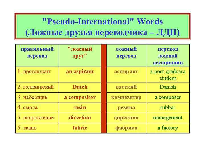 "Pseudo-International" Words (Ложные друзья переводчика – ЛДП) правильный перевод "ложный друг" ложный перевод ложной ассоциации 1. претендент an aspirant аспирант a post-graduate student 2. голландский Dutch датский Danish a compositor композитор a composer resin резина rubber direction дирекция management fabric фабрика a factory 3. наборщик 4. смола 5. направление 6. ткань